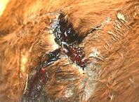 Screw-worm flies only breed on the wounds of living animals. The female fly lays up to 250 eggs on the edge of a fresh wound. After hatching, the larvae (or maggots) enter the wound and burrow into the underlying tissue to feed. As they grow, they form a huge mass of maggots, and cause extensive tissue damage. Infested animals can't dislodge the larvae by licking or biting, and may eventually be 'eaten alive'.