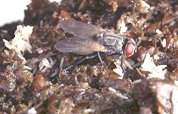 The common house fly, seen at the right, lays its eggs in rotting, moist material. The maggots emerge from the eggs in warm weather within 8 to 20 hours, and they immediately feed on, and grow in, the material where the eggs were laid. These larvae are 3 to 9 mm long, and creamy white in color.