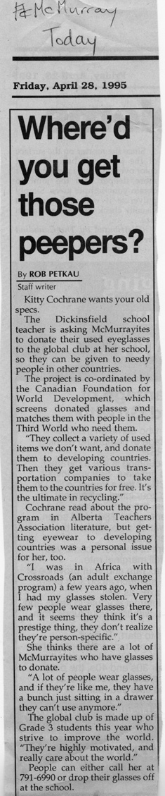 Collected 62 pairs of eyeglasses to be sent to needing eyes in developing countries via Canadian Federation for World Development