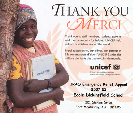 Instead of receiving costly medal awards at end of the year, the club and our school donated the cost ($50) to the University of Alberta Burn Unit on behalf of the local Firefighters, in appreciation of their help with our school fires this spring, recognizing that some children are not as lucky as we were with our fires