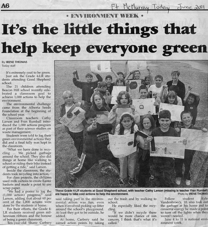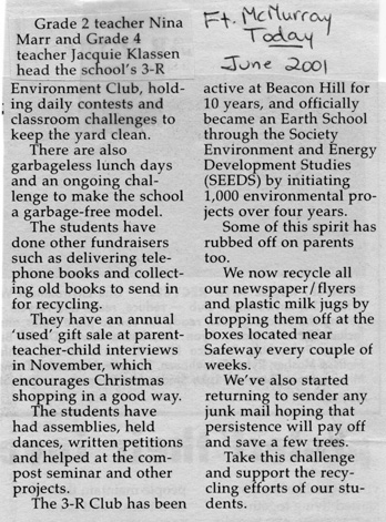 Students at Beaconhill Elementary School have performed over 1,000 environmental projects, including instituting daily classroom recycling, used gift sales, garbage free lunches, and school yard clean ups. They were recognized with the prestigious Wood Buffalo Environmental Award in December 2002.