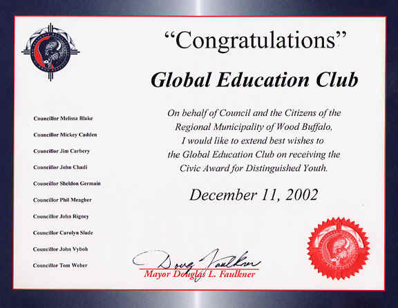 Les membres du Club d'éducation globale recevant le prix «Wood Buffalo Youth Citizenship» |
